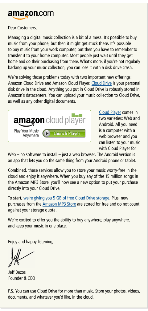 The following is featured on amazon.com . It introduces Amazon latest feature the Amazon Cloud Player. The Amazon Cloud Player gives current users 5GBs of storage on their Cloud Drive. There are additional plans one can buy ranging from 20GBS-1000GBS. Mainly this storage is used for,but not limited to, music. You are then able to access the music( or other files) from your computer or Android device. The Amazon MP3 android app now has an option to access you music on the cloud. This allows you to create you own music streaming player. This is another huge step for amazon. This also gives android a huge advantage. The Prime Instant Video, Amazon Android App Store( with a free app a day), and now Amazon Cloud Player have been huge announcements. I look forward to what amazon has in store for the rest of the year or if they have shown their hands early. I am hoping an app for Prime Instant Videos will be in the future for android. These steps also help with my theory of an android based tablet by Amazon.