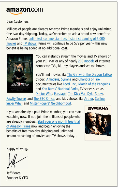 We touched on the rumor and turns out it was true. Amazon today announced they are offering unlimited streaming of 5000 Movies and TV shows for their Prime Subscribers at no additional cost. This is a great plus to the already great service of free 2-day shipping that prime member receive as well as optional $4 1 day shipping. I for one am excited to check it out being a Prime member myself. For those interested there is a free 1 month trial. Below is the image of the announcement. Glad to see amazon is adding benefits instead of charging extra. Great job Amazon!