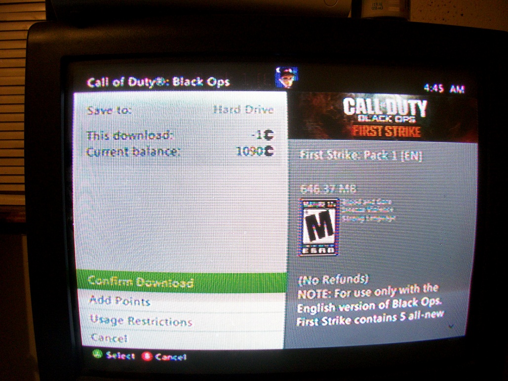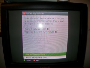 Call of Duty: Black Ops has sold amazingly well. There is no surprise that the First Strike Map Pack will sell pretty well. With any and all major DLC there are problems. I have found a few and decided to share before it is fixed. The first picture below shows the map pack download costing -1 Microsoft point. Well just out of curiosity I decided to see if it would work or not. The next picture shows it the required balance being 42,93,967,295 which comes out to be $53,687,091.19. This of course is going to get fixed and no one will end up buying it for that price, but I feel it is a worth wild to share to those who probably will not see it before it gets fixed. I apologize for the picture quality not being crystal clear, but I’m sure you can make out what it says. And before I post I have checked it again and the problem is fixed so you don’t have to worry. Just enjoy the mistake of Microsoft that is below.