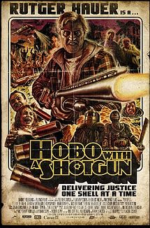 As you’d probably expect from a Grindhouse flick it was bloody, gory, and over the top with the violence and cheesy writing. And yet in that living room we groaned, laughed, cheered and even applauded at points. It’s the second full length film to be made from the fake trailers at the beginning of the Grindhouse double feature (the first being “Macheteâ€) and stars Rutger Hauer as the Hobo. The basic plot is that the Hobo arrives in a crime-stricken town and almost immediately witnesses the horrors that a crime boss and his sons inflict and encourage. The Hobo later saves and even befriends a prostitute. Though he only wants to beg enough money to purchase a lawnmower he finds that he’s soon pushed to his breaking point and instead gets a shotgun.