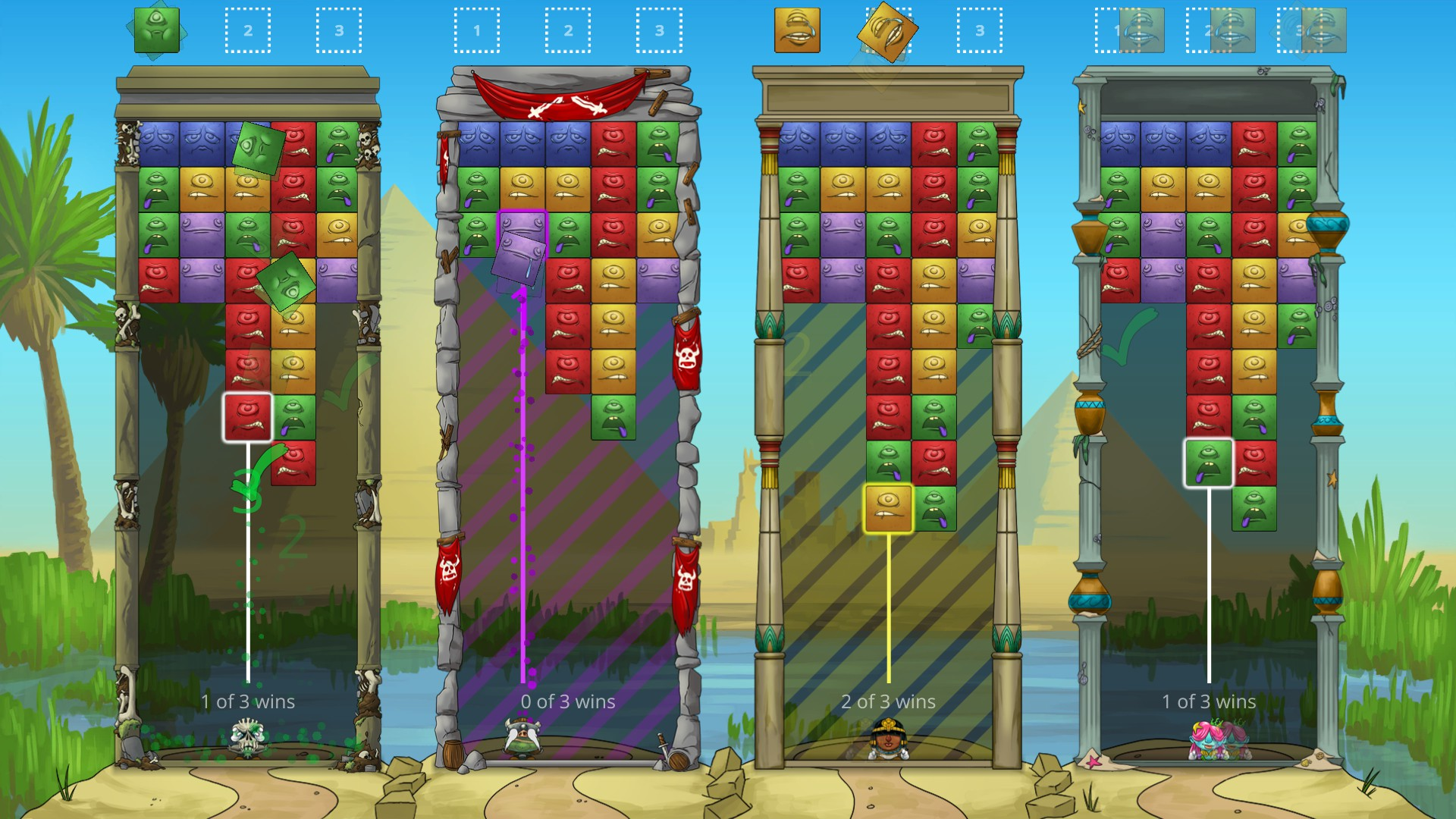 Tumblestone is a Match 3 Puzzle game. The twist is you have to clear the board and think a step or two ahead of your current move. If you pick the wrong colored tile you might not be able to match 3 more and then you have to reset the board. The mode I played was a 4 player vs mode where each player had the same puzzle and first to clear the board won the round. It gets really competitive among friends and those are some of my favorite games. I am happy to say that there is online co-op as well as local co-op.