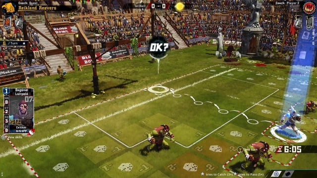 I know if you think about football is turn-based but this isn’t like that. Each half is 8 turns and during each turn you can move each player individually a certain number of invisible spaces on the field. If a player is standing in a space adjacent to and opposed player they can attack the player whether they have the ball or not. When you attack you roll die to see what action you can do. The action could be a simple push but where the fun in that it is called Blood Bowl so the action you really want is to upper cut them in the jaw and possibly KO them or maybe even kill them. If you have fellow teammates around you to ups your strength and can add one or two extra dice to give you a better chance at a favorable roll. That can work against you as well if the opponent has friends or is just plain stronger than you the dice will so up red meaning that the opponent can choose from the die which action happens. Attacks aren’t the only “dice rolls†that happen if you want to pick the ball up off the ground you are given a percentage of success and you hear the sound of dice being rolled, the same happens if you want to take a couple extra steps past your given movement area or if you want to run one space away from an opponent. If you fail any of these and it ends with a one of your players or the ball falling on the ground it’s turnover, which is a forced end turn. There were plenty of time my first action was to attack an opponent and I ended up rolling a player down which is when they uppercut my player and that immediately ends my turn.