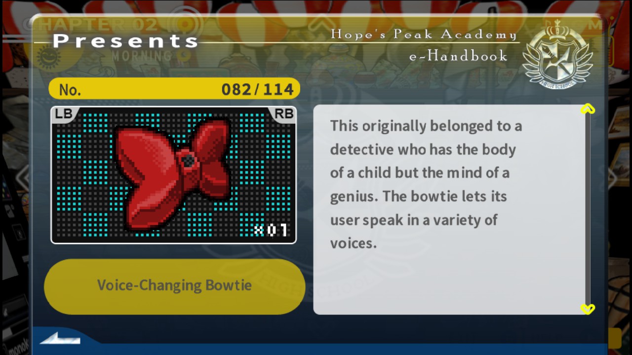 Sometimes I felt like I was playing a game for a much younger audience, from just the idiotic things the characters said. One example would be for one murder a cosplay robot suit was involved. Don’t ask. And one character tried on the suit during the investigation and makes the comment how to can’t bend at the waist. Then during the trial when asked the question of how was the body moved the same character says they bent down to move it. I almost missed my chance to shoot that weak point because I was so dumbfounded.