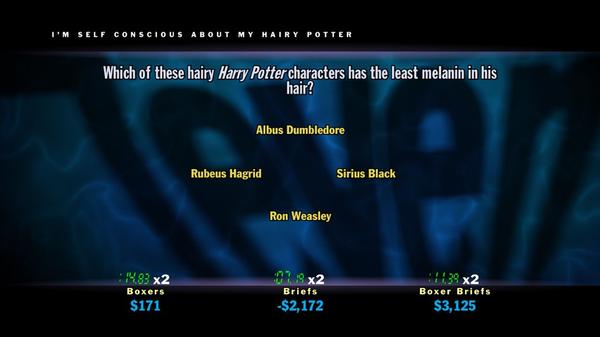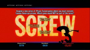 The games themselves work mostly as a trivia game would be expected to. A question is presented, and a timer appears. The faster you answer, the more points you get if you right. Conversely, if you’re unsure of an answer, it’s often wise to wait, so you don’t lose as many points if you’re wrong. There are no lifelines of any sort in single player, but if you’re playing multiplayer, you are given one screw to use in the ten questions. This gives one player 5 seconds to answer. If he’s wrong, not only does he lose money, but you get a nice cash bonus, and the opportunity to answer the question correctly. Of course, if the player getting screwed answers correctly, you’ll be the one losing cash. It’s a nice little addition that rewards players for knowing what subjects their opponents are weak in. There’s also one question per episode designated as a “Dis or Dat”, where players have 30 seconds to identify seven words or phrases as belonging to one of two categories. These are often some of the most hilarious parts of the game, providing such phenomenal juxtaposition as “Newspaper or Sex Act” and “Surgeon General or Dr. Pepper Knockoff”. Players are rewarded for choosing correctly, as well as for finishing quickly.